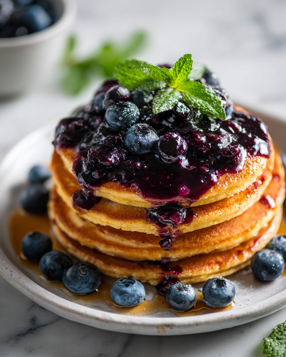 - Stack pancakes and drizzle with blueberry compote, garnishing with extra blueberries if desired.