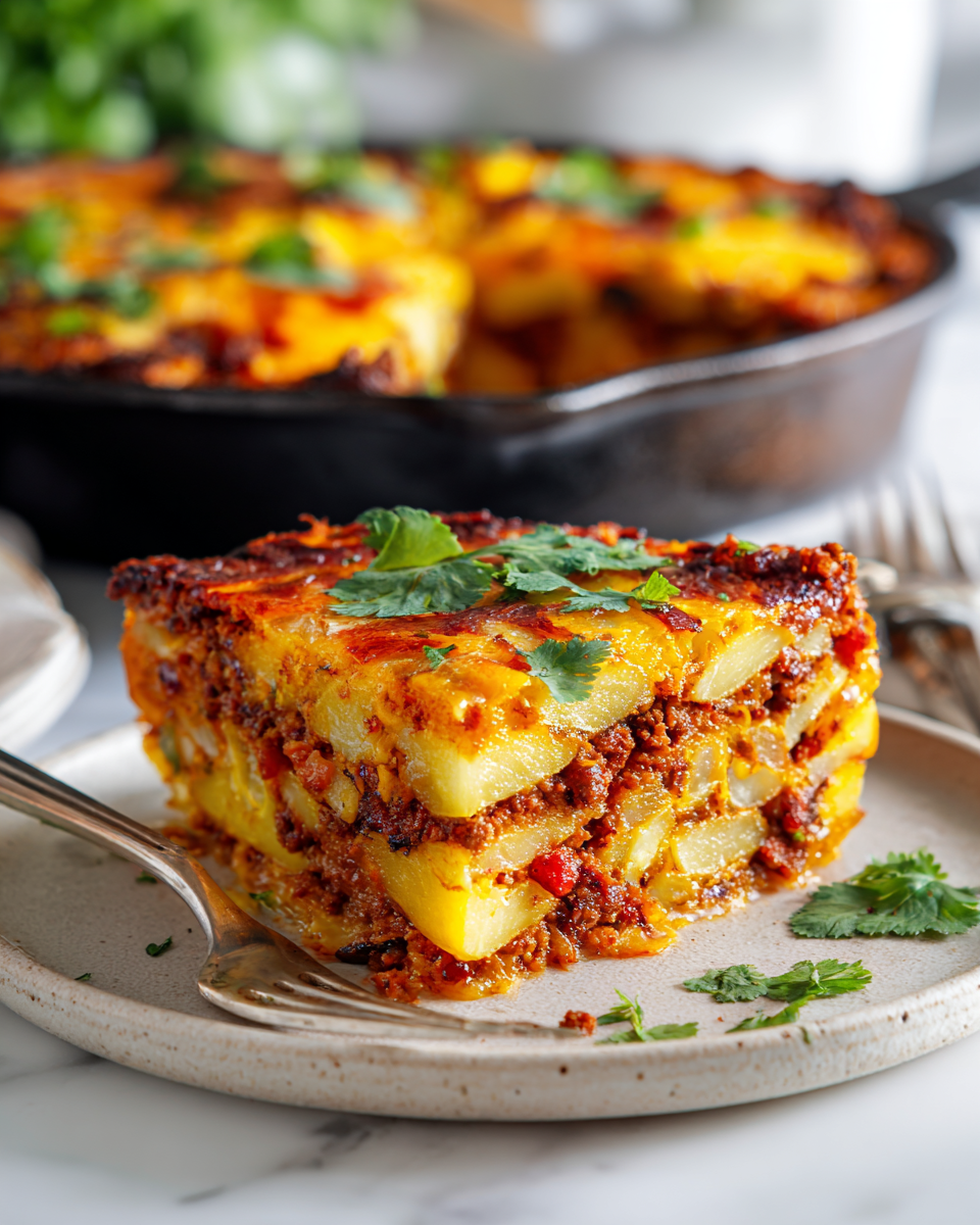 - Pour egg mixture over chorizo and potatoes in the skillet, sprinkle cheese on top, then bake in a preheated oven at 375°F (190°C) for 25-30 minutes.