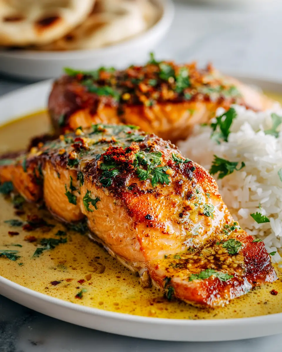 Allowing the salmon to simmer gently in the curry sauce enhances the overall flavor, and the garlic butter drizzle elevates the dish further!