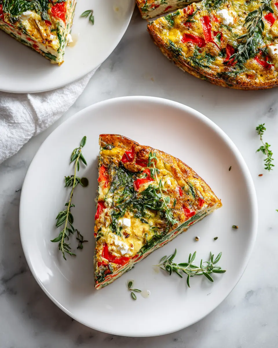 - Pour the egg mixture into the skillet over the vegetables and sprinkle the red peppers and feta on top.