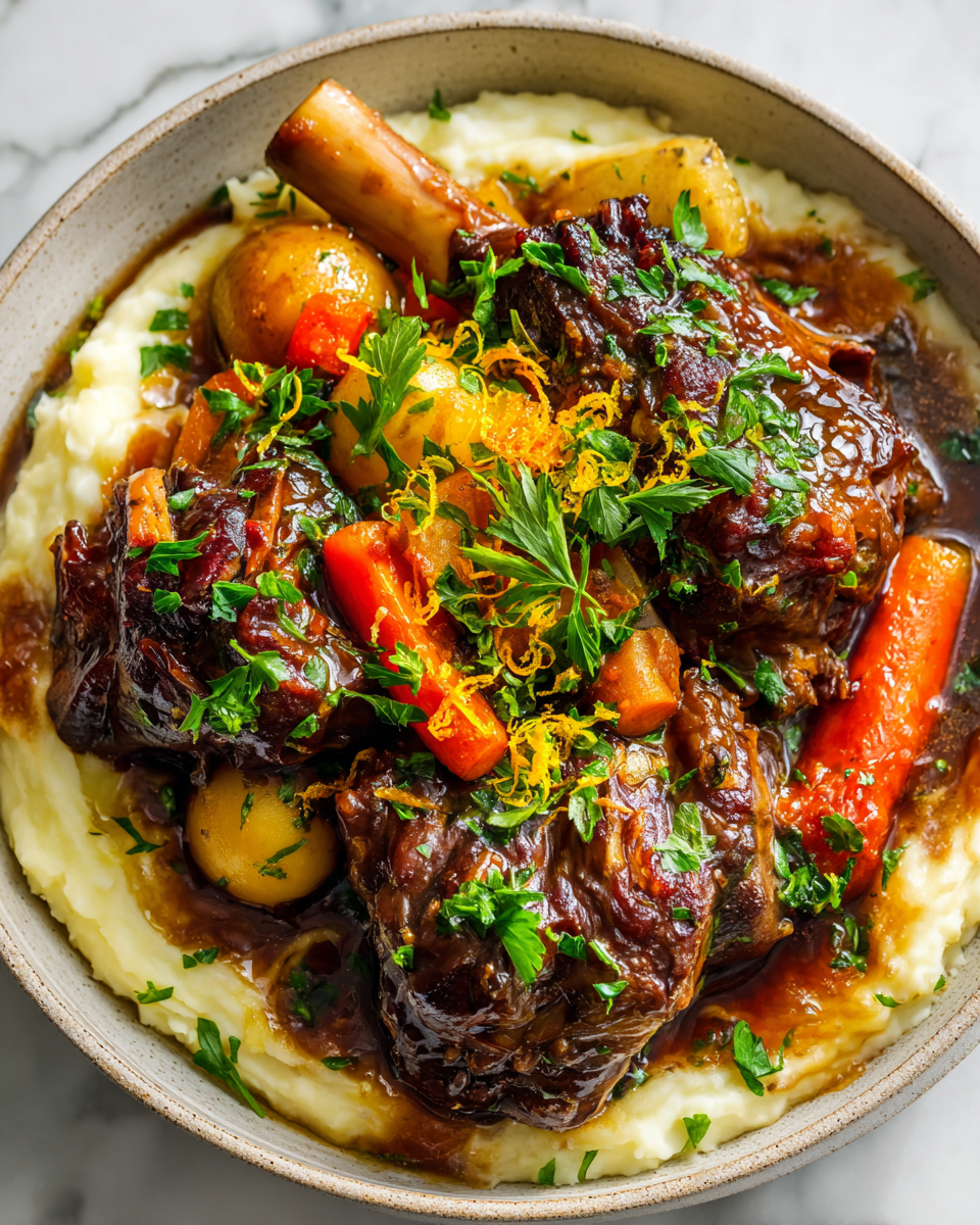 - Remove the shanks from the pot and let them rest for a few minutes. Meanwhile, reduce the sauce on the stovetop for about 10 minutes. Serve over creamy mashed potatoes or polenta, garnishing with fresh parsley.