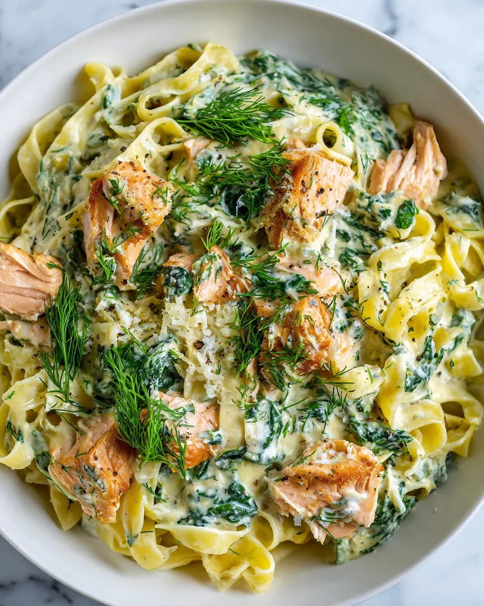 - Toss in cooked pasta and mix until everything is coated in the creamy sauce. Serve immediately, garnished with fresh dill or parsley.