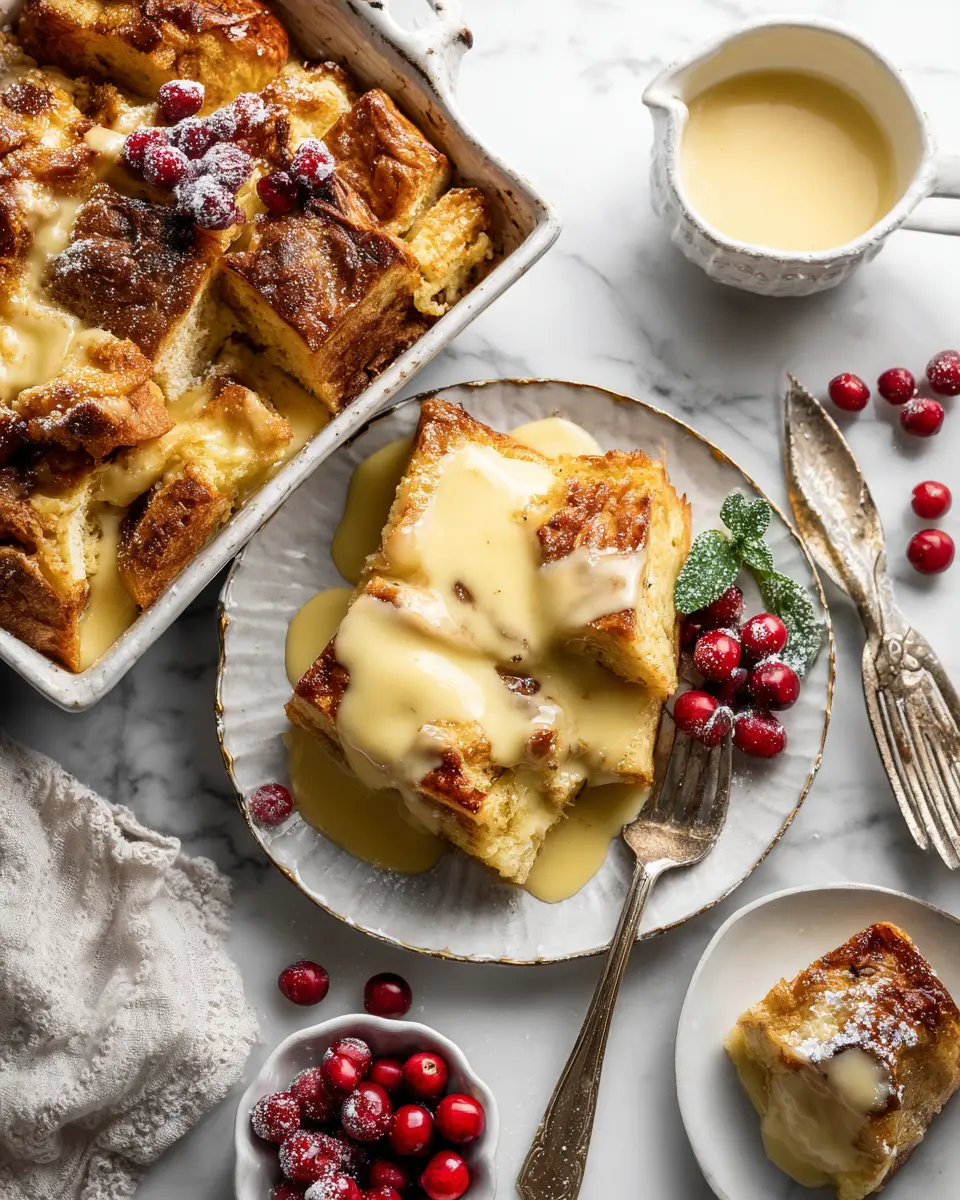 - Once baked, allow the pudding to cool slightly before serving warm with the vanilla sauce drizzled over each portion.