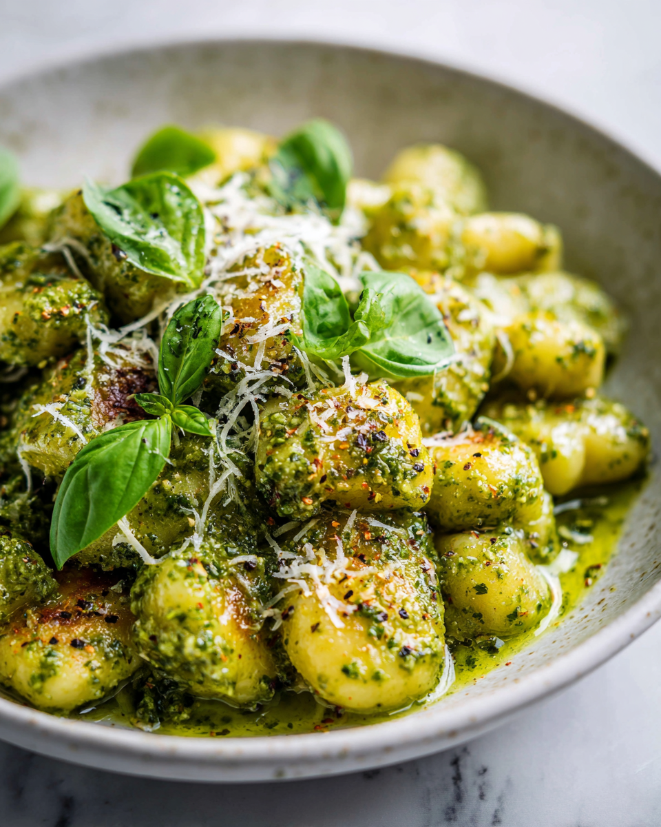 - In a large skillet, toss the cooked gnocchi with pesto over medium heat, adding reserved pasta water if needed. Serve immediately.