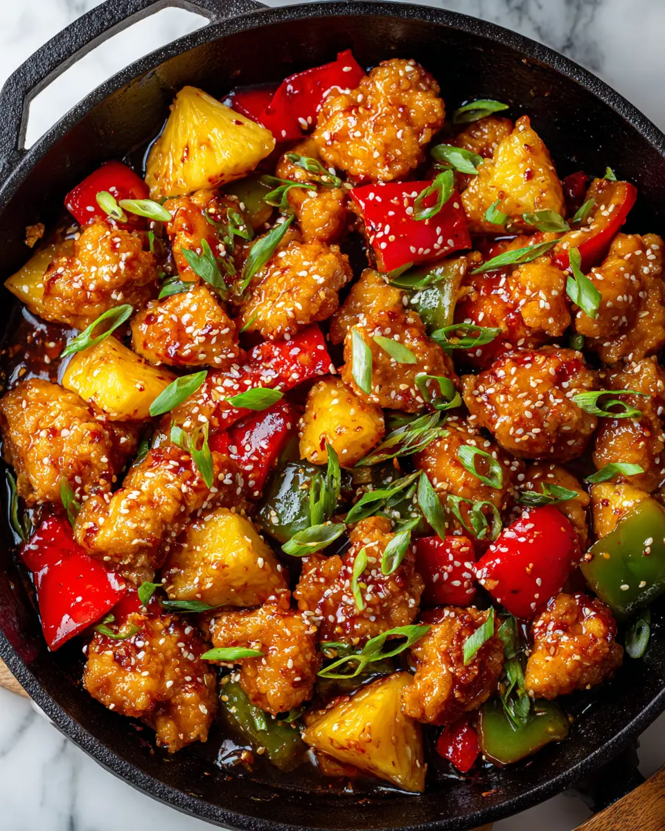 - Add the fried chicken and fresh pineapple into the sauce. Stir to combine and let it simmer for another 2 minutes.