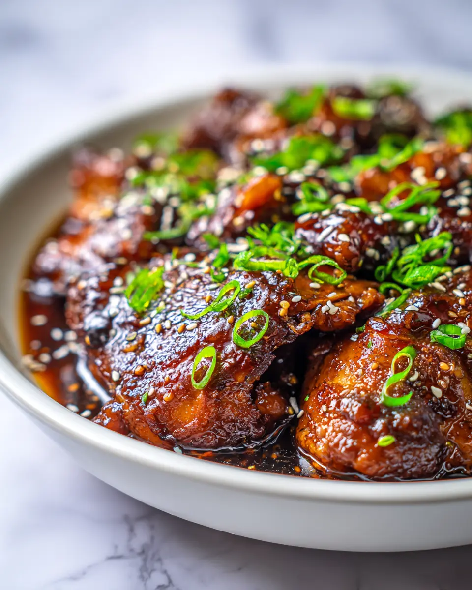 - Shred the chicken and return it to the sauce. Serve over rice or vegetables, garnished with sesame seeds and green onions.